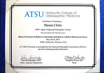 オステオパシー発祥の地・アメリカのカークスビルにある、創始者A.T.スティルが設立した大学(KCOM)と提携した専門プログラムを修了しており、その技術を提供できる施術者は全国でも限られています。